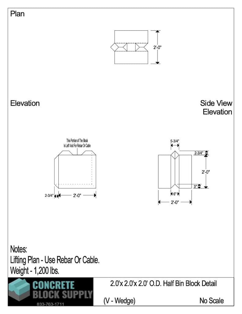 We provide bin blocks in Bozeman, MT and other areas all over the great U.S of A. These blocks also go by the name, “v-wedge” blocks because of their unique interlocking feature: v-wedges. Each block has four of these wedges which enable them to slide together and interlock with one another. On the top and side of the block, you can find a protruding v-wedge and on the bottom and opposite side, you can find an inverted v-wedge. Another helpful feature is their rebar handle loops. One of these can be found on the top of each block. This loop enables these blocks to be moved without the use of complicated rigging equipment. Now, we offer these blocks in three different sizes for the city of Bozeman: a 6’ x 2’ x 2’ block that weighs 3,600lbs, a 3’ x 2’ x 2’ block that weighs 1,800lbs, and a 2’ x 2’ x 2’ block that weighs 1,200lbs. When it comes to transporting these blocks, each trailer can carry either thirteen of the 6’ blocks, twenty-six of the 3’ blocks, or thirty-seven of the 2’ blocks. These blocks also have the option to have decorative faces, so please contact us for more information about this feature. Thank you!